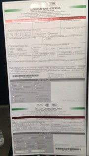 Technically, this post begins in the air over the Gulf of Mexico, I presume. I am in an aisle seat so I truly have no concept of where we are geographically. However, I wanted to share that my first “survival conversation” just took place. The flight attendant hands out two forms to all passengers who are not traveling on a Mexican passport. These forms are a Mexican immigration form and a customs form. These must be completely and accurately filled in before I get in line for Mexican immigration at the DF airport. Being the consummate planner that I am, I failed to pack a pen for this. Go figure! Everyone on the plane sitting around me is Mexican (we will assume Mexican because this is a flight to the capital of Mexico, not because they are all speaking Spanish. I know better than that!). The gentleman next to me has a pen. I wait quietly for him to finish his forms and then I ask, “Disculpa, ¿puedo user tu pluma?” He hands me the pen. Phew! Mission accomplished. See, now that wasn’t so scary, was it? 😀