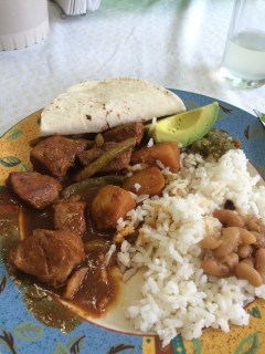 After school, we returned home for comida, the biggest meal of the day. We started with noodle soup followed by beef stew, rice, beans, avocado and tortilla. Very spicy and very delicious. Here it is!