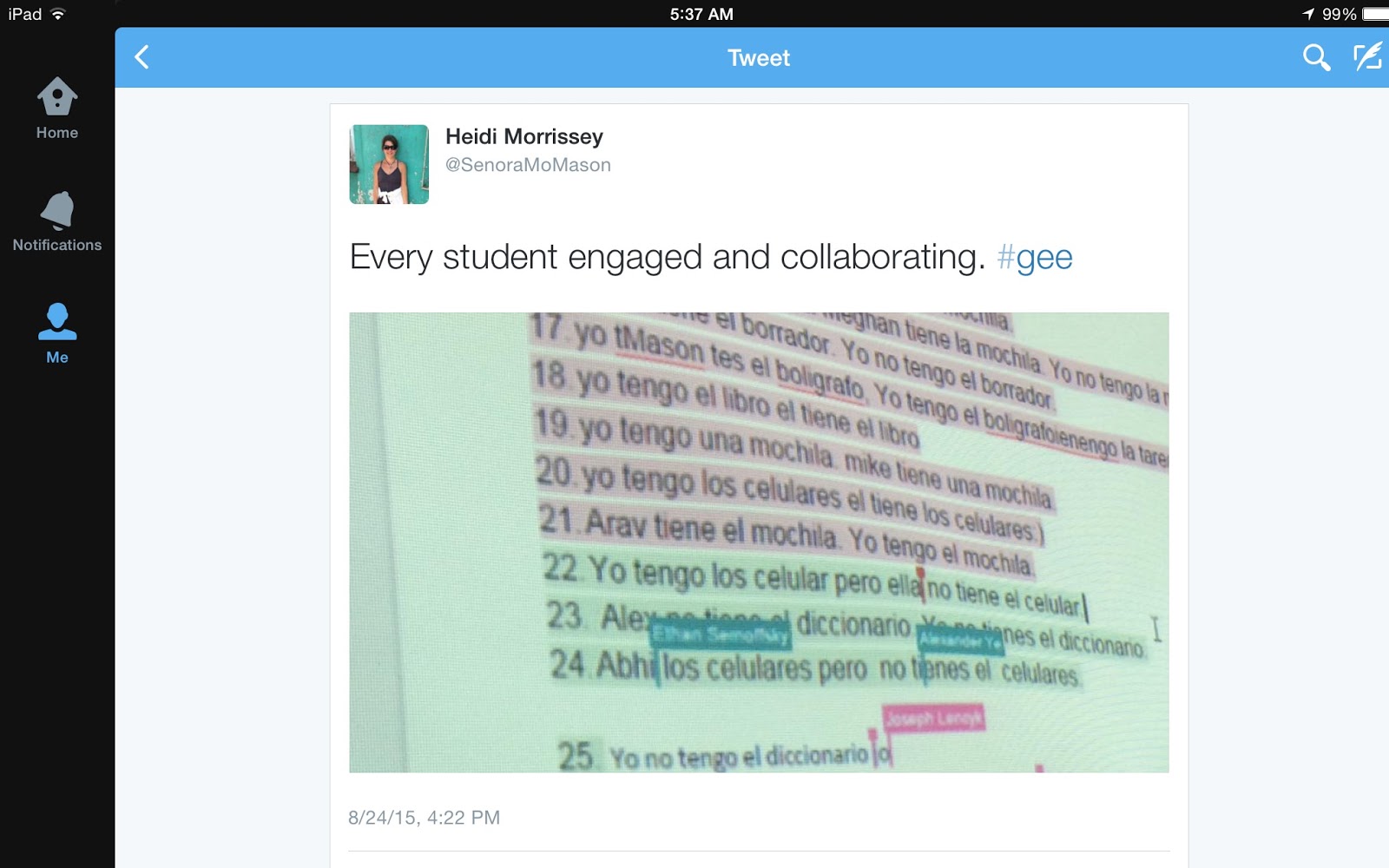We have completed two full weeks of school now and I can honestly say that things are going very, very well. All of my students have personal learning devices with them each day which has created lots of new opportunities. It has also created a lot of small stumbling blocks that we have to work through each day. For example, what if my lesson plan is entirely based on using Google docs and the internet, but 3 students did not bring their devices? What if one student’s device all of a sudden starts flashing and the keyboard won’t work? What if a student has never used a Google product before and is unable to keep up with the students who have been using Google for two years? What if the document I labored over and scrutinized before posting to Google Classroom has settings that won’t allow students to edit it? These are little things that take time away from instruction every day. I’m not bothered by them. We are learning together as a class what works and what doesn’t work. I’ve had some fantastic days where we have used technology the entire time. I have had equally fantastic days where the Chromebooks stay in the backpacks. It’s a learning process, but I plan to try something new each week. Students seem to enjoy using their devices to track assignments, write papers and share with others. However, there have been a few students who have asked if I could please just PUT IT IN WRITING ON A PIECE OF PAPER! I meet every student where he/she is so that is never a problem.
