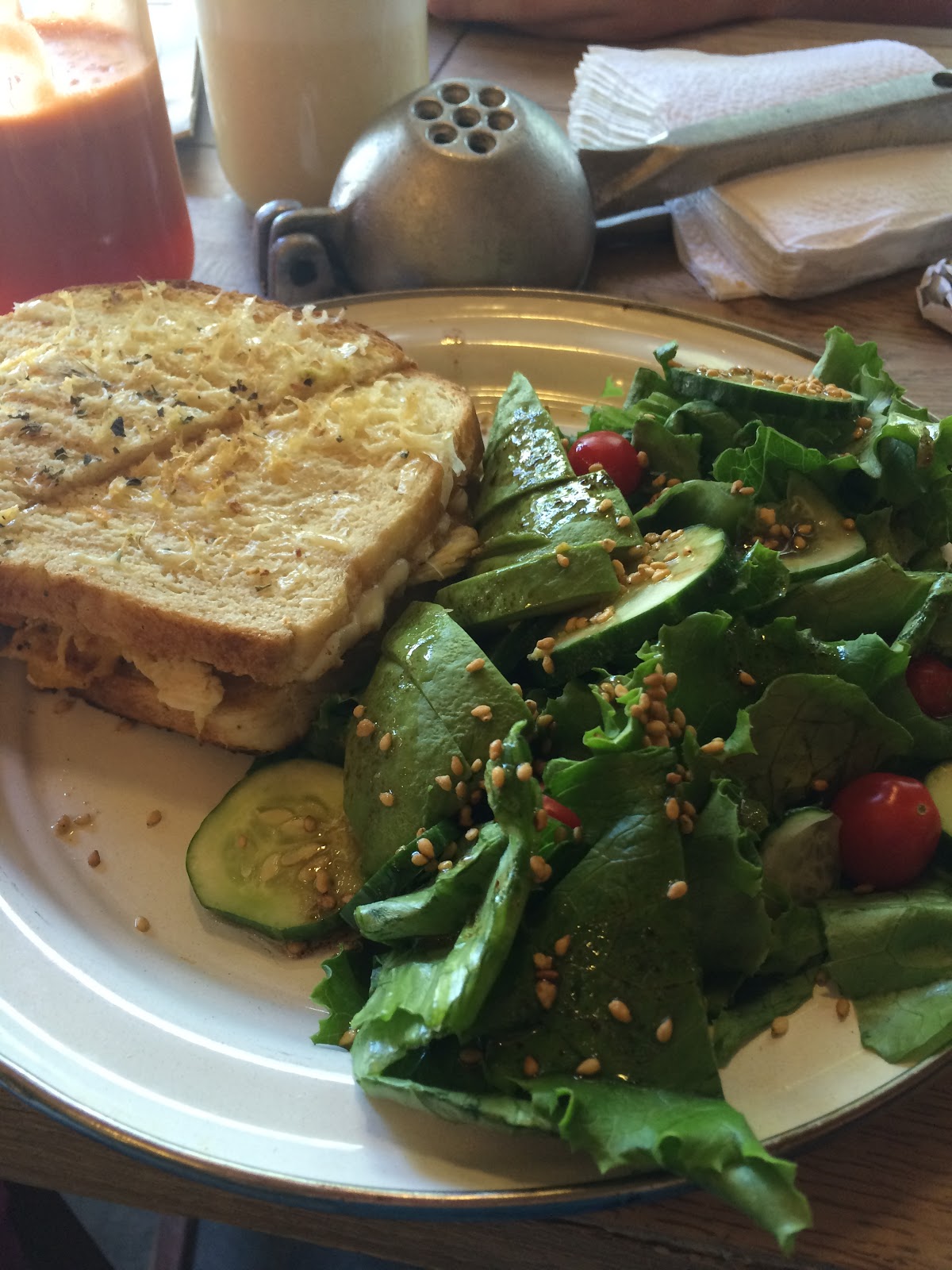 We Ubered back to the hotel. We were getting hungry so we went to a cafe called Ojo de Agua. Known for their fresh juices, salads and sandwiches, we figured we could grab something to go and then eat on the bus to Cuernavaca. When we got to the cafe, we decided to go ahead and eat there. What a place! For about $15, Kevin and I each had a freshly squeezed juice. Mine was carrot and apple, his was yogurt with fresh pineapple. I had a chicken with chipotle mango chutney sandwich. Kevin had a four cheese with guanabana spread (jam) sandwich. Both sandwiches came with fresh salad greens topped with half an avocado, tomatoes, cucumbers and prailine sesame seeds. Amazing!