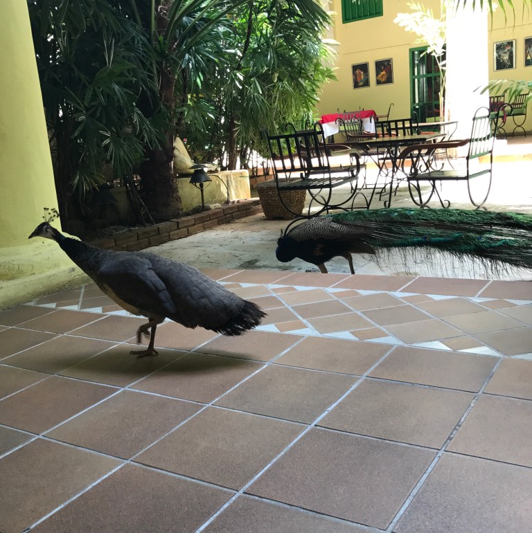 We caught another taxi back into Havana and were dropped off at the Rum Museum. While we didn’t take a tour, we did walk around inside long enough to realize what a tourist trap it was. A quick picture and we were back off to the streets of Old Havana. Today the streets were much more crowded than on Wednesday. The weekend tours have arrived apparently! Taking a tip from a tour book, we stopped at the Hostel de Conde Villanueva, a small boutique hotel where peacocks run wild and the internet is free. After thirty minutes of relaxation and reconnecting, we headed back out to find a bite to eat.