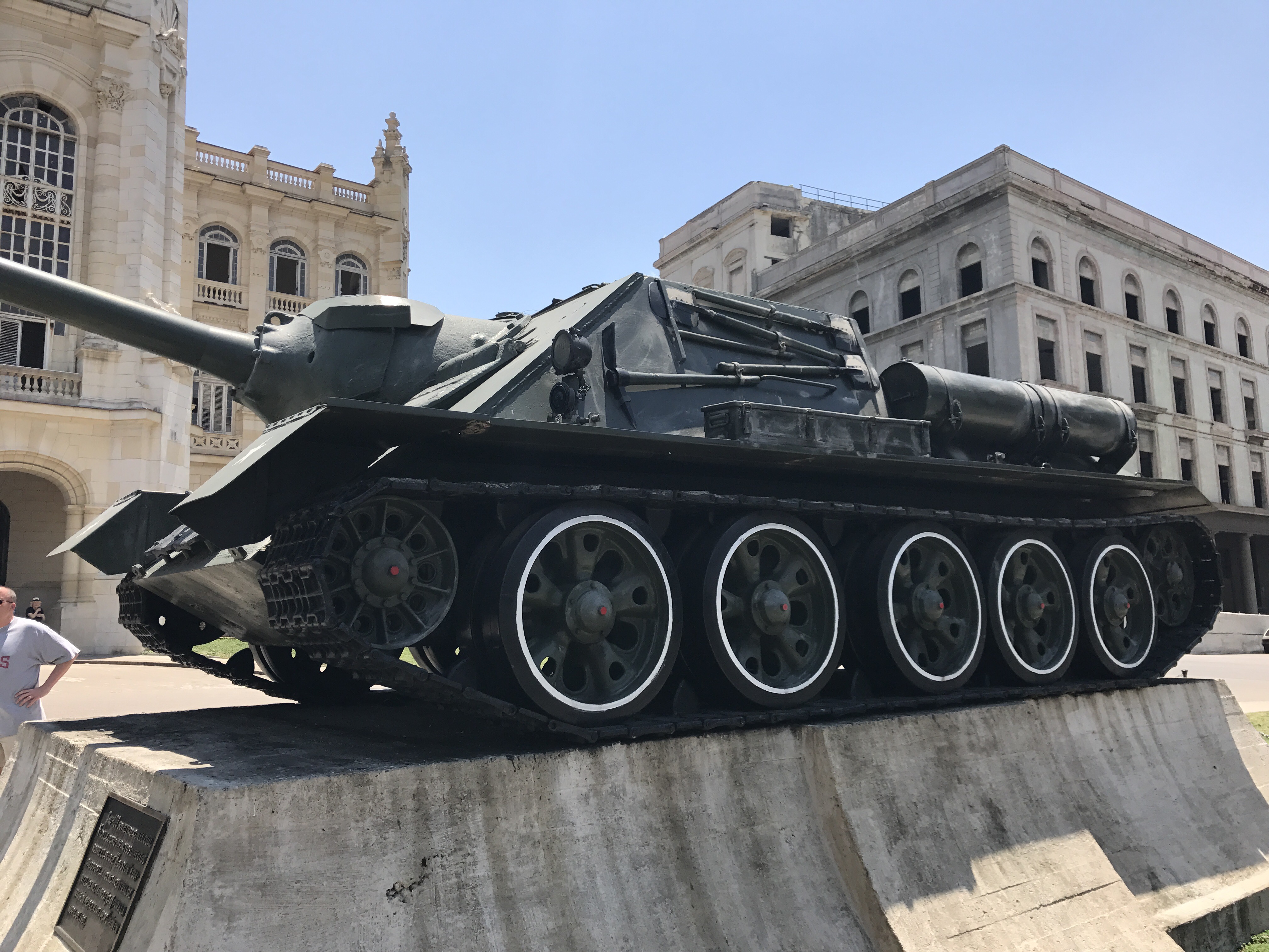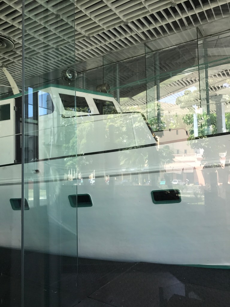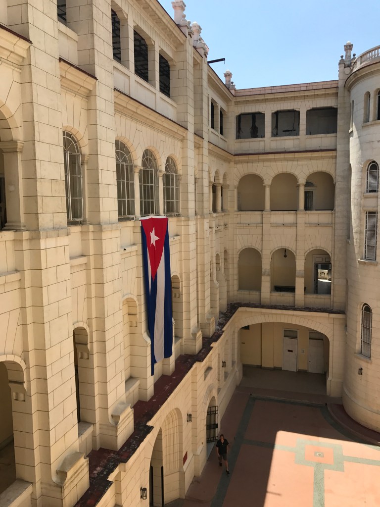 We walked next to the Museum of the Revolution in Central Havana. This beautiful building sits close to the waterfront and used to be the presidential palace until Fidel turned it into a revolutionary museum in the 1960s. The walls of the exterior are riddled with bullet holes from one of the first attempts by the Revolutionary Army to take over Havana. Inside, there are many rooms devoted to telling the story of the Cuban Revolution from 1953-1959. There is a memorial to Che and Camilo Cienfuegos, the two main generals during the movement. We also saw the Granma Yacht which is the boat that Castro took from Mexico to Santiago, Cuba in 1956 when he began the official revolution. It’s a dated facility with disgusting bathrooms. There was an interesting display of American Presidents and how stupid they are which we thought was funny. Bottom line, this is a fascinating look from the Cuban perspective at the history of the Cuban Revolution. However, the dilapidated interior, lack of air circulation and highly subjective material made it a bit uncomfortable for me. One would think that this place would be sparkling and modern given the importance that Fidel placed on propaganda for the Revolution. Instead, it’s a dated museum in a beautiful old building.