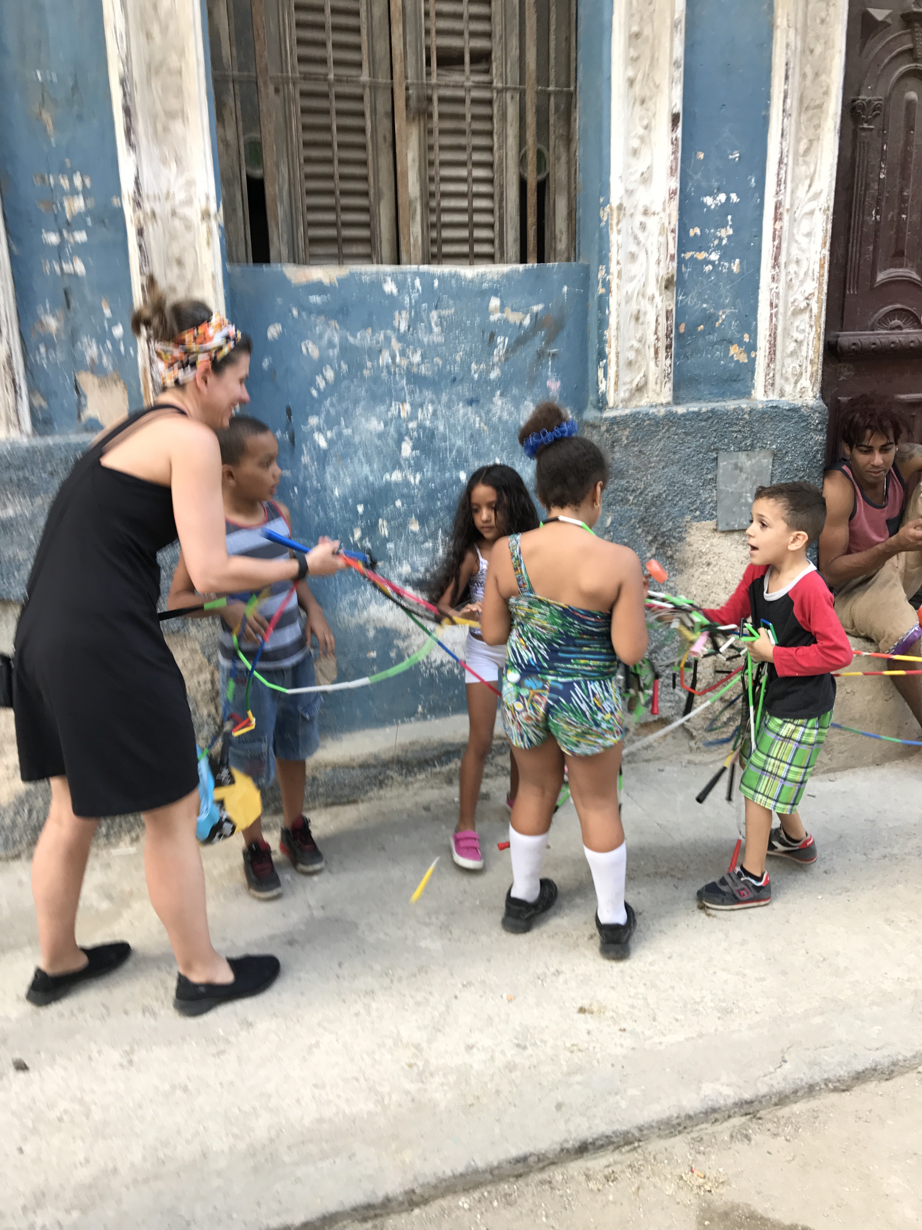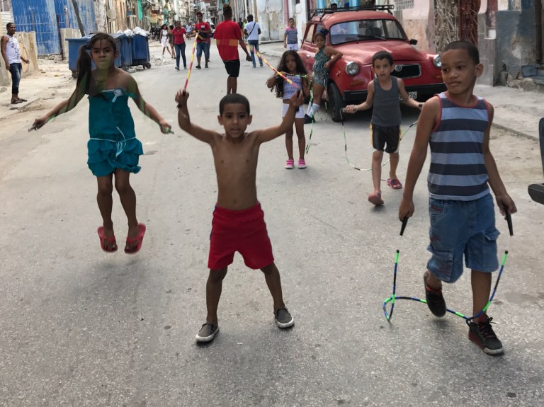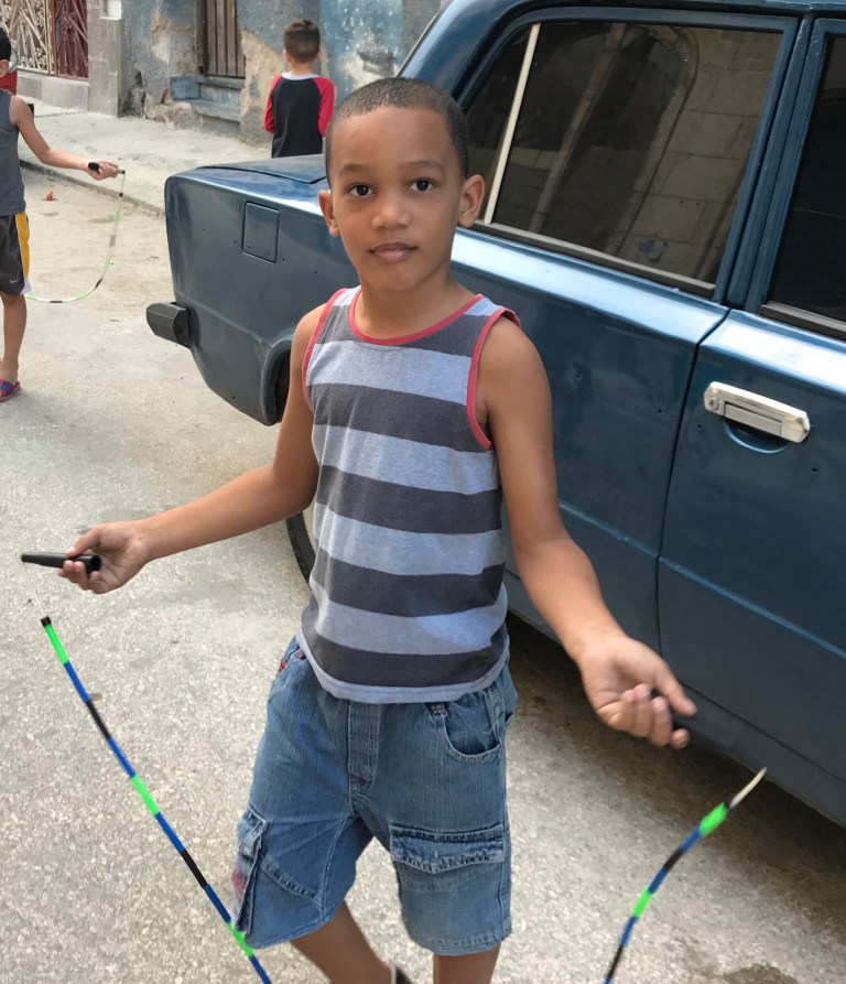 Well, last night didn’t go as planned. We had planned to hit the swanky night club/art studio called La Fabrica de Arte Cubano, but decided to stay in Central Havana to give jump ropes to the local kids! What a great decision! It was so much fun to see their faces light up when we brought out the ropes. For three hours, I played on the street with them. Some of the parents even tried to jump. We met a nice guy named DJ from California who turned the ropes for a bit as well. It is true that jump rope is a worldwide sport. It’s universal. I only wish that Kevin had been here to really show them some tricks. They would have been amazed! Here are a couple of pictures of our new little cutie pie friends. They were so adorable. Several of them even wanted to count to 20 in English for us. They might have skipped 13, 15 and 17, but it was so sweet! They loved my phone and when I showed them my pictures, they came across one that had Donald Trump in it. They asked me if that was Presisdent Obama. Talk about innocence (and censoring of media of all types)!