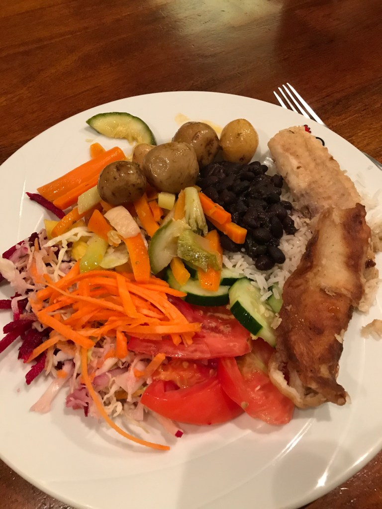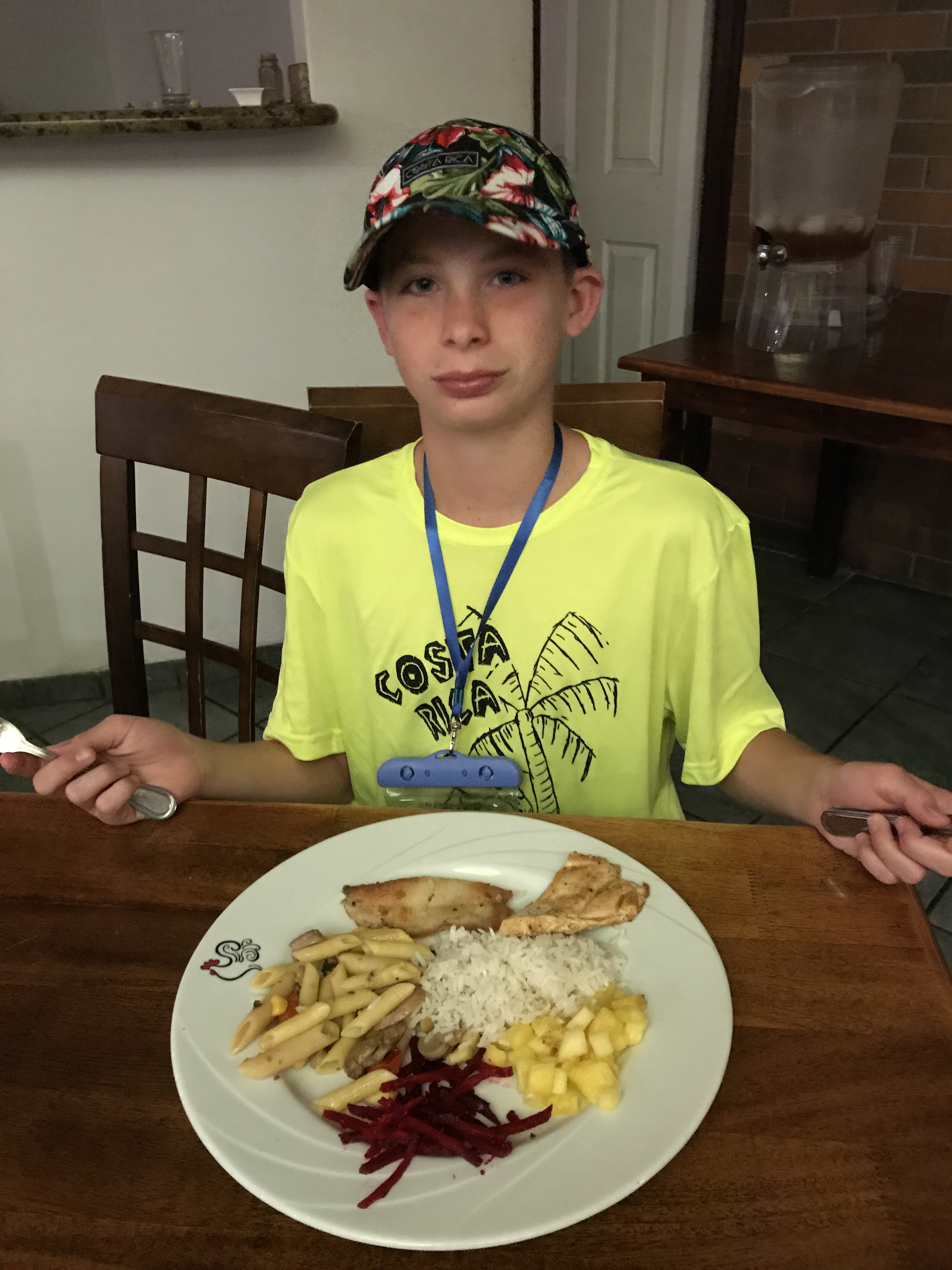 Our first official “gathering” was dinner across the street at a place called Roosters.  It was a buffet and of course, I tried nearly everything. I’ll start at the top and go around the plate clockwise.  First are potatoes, black beans and rice, tilapia, cucumbers, tomatoes, radish, carrot, beet, cabbage salad with fresh pineapple and finally, sautéed carrots and squash. I was very impressed with how much the kids all tried.  There was also pasta and chicken which I did not have. The kids enjoyed some cas juice (cas is also known as Costa Rican guava).  It’s a green tart fruit that is almost exclusively used in juices and has been described as a cross between a lemon and a grapefruit. Personally, I avoid the juices at most meals as I don’t like to have so many sugary drinks.  This drink was closer to lemonade than actual juice, but the kids seemed to like it a lot!