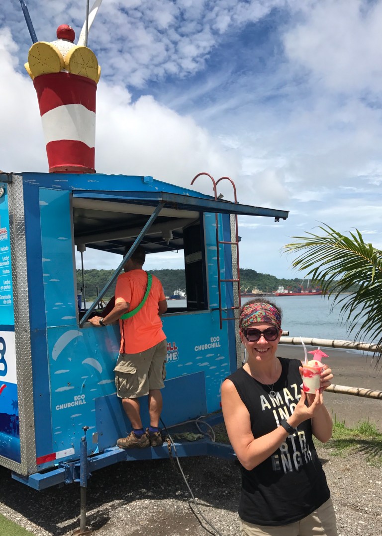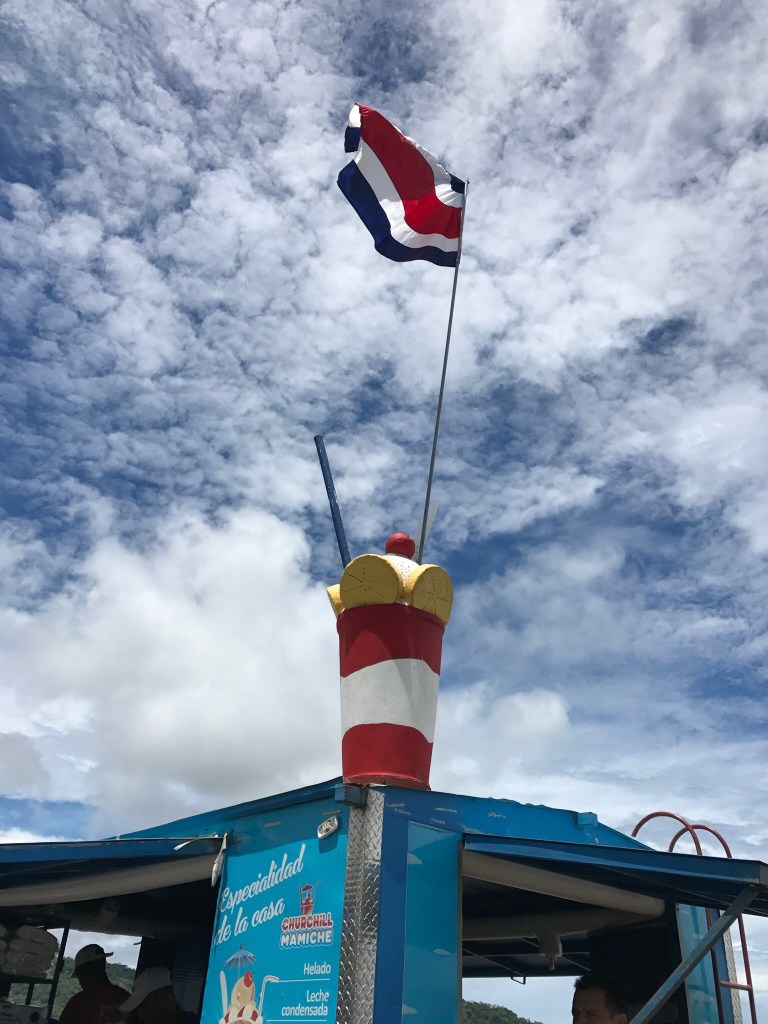 We have left the Monteverde cloud forest. If you can’t tell, this is NOT my favorite part of Costa Rica. I am definitely more of a city or beach girl over a forest and mountain-type. We took a leisurely trip down the mountain from Monteverde to the town of Jaco. It’s about a three hour trip that we broke up into three short segments. We made a restroom stop, a souvenir stop and a most delightful treat stop! This was my favorite part of the trip so far…the Churchill! We stopped at the neatest little beachside stand to get the famous Costa Rican frozen treat known as the Churchill (supposedly because it looks like Winston Churchill?!?!!). This is the strangest concoction of red slushee, followed by a huge scoop of powdered milk, canned (or fresh fruit), a scoop of ice cream, sweetened condensed milk, sprinkles or nuts and either a cherry or a marshmallow on top. Pure sugar! I’m not one to have dessert at 10:00am, but this was amazing! Mandy and I decided on the spot that we will be making these in Spanish Club this year!