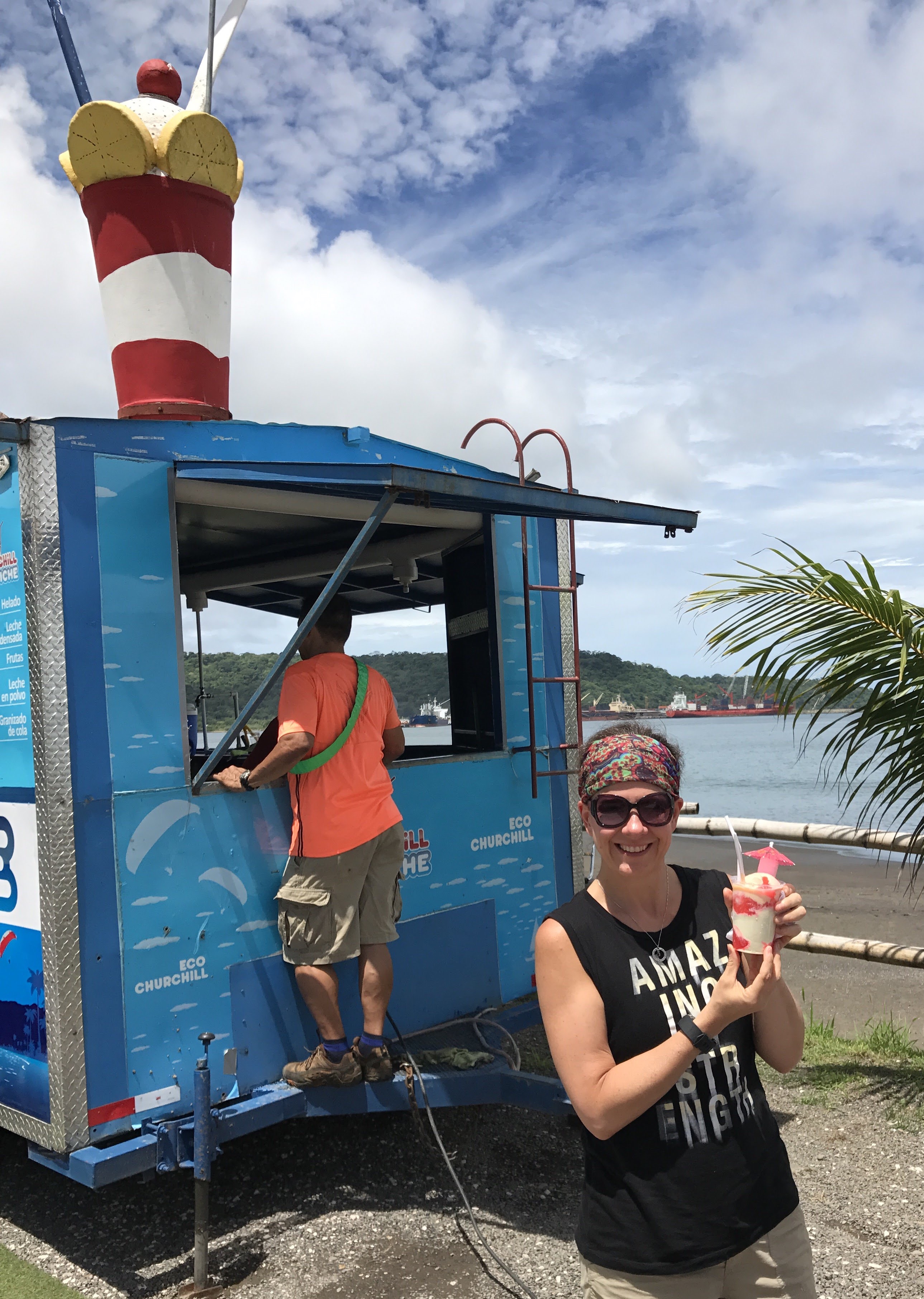 We have left the Monteverde cloud forest. If you can’t tell, this is NOT my favorite part of Costa Rica. I am definitely more of a city or beach girl over a forest and mountain-type. We took a leisurely trip down the mountain from Monteverde to the town of Jaco. It’s about a three hour trip that we broke up into three short segments. We made a restroom stop, a souvenir stop and a most delightful treat stop! This was my favorite part of the trip so far…the Churchill! We stopped at the neatest little beachside stand to get the famous Costa Rican frozen treat known as the Churchill (supposedly because it looks like Winston Churchill?!?!!). This is the strangest concoction of red slushee, followed by a huge scoop of powdered milk, canned (or fresh fruit), a scoop of ice cream, sweetened condensed milk, sprinkles or nuts and either a cherry or a marshmallow on top. Pure sugar! I’m not one to have dessert at 10:00am, but this was amazing! Mandy and I decided on the spot that we will be making these in Spanish Club this year!